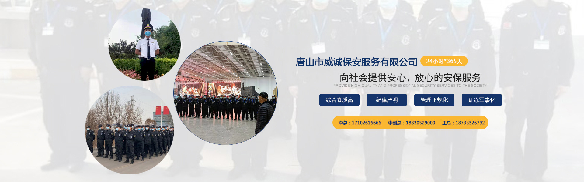 唐山市威誠保安服務有限公司自成立以來以“嚴防死守、忠于業(yè)主”為服務原則,以“客戶滿意、 合作共贏”為根本目標。以科學的管理、多方位多層次的服務,建立了首問責任制,完善了走訪、回訪 、滿意度調(diào)查、末位淘汰的預警管理,不斷提高服務質(zhì)量,提高業(yè)主滿意度,提高企業(yè)形象。秉承“誠 實守信,紀律嚴明,團結協(xié)作,致精致誠”的服務理念,為客戶提供高品質(zhì)、多方位、專業(yè)化的保安服務。 本公司制定了嚴謹?shù)亩ㄏ蛘猩?、崗前培訓、考核錄用、崗中培訓、持續(xù)培訓、末位淘汰制等一整套完善的管理體系。可以根據(jù)客戶的要求實地勘察評估,以量身定做的方式提供安保防范服務。